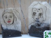 schoenveter/ touw/garen-druktechniek. Acryl op hout op ijzer